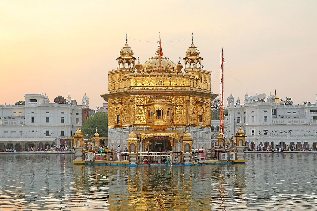 The Golden Temple (also known as the Harmandir Sahib, lit. 'abode of God', is a gurdwara located in the city of Amritsar, in Punjab, India. It is the preeminent spiritual site of Sikhism. In 1604, Guru Arjan placed a copy of the Adi Granth the holy book of Sikkhism, in the temple. It has been repeatedly rebuilt by the Sikhs after it was destroyed several times. Maharaja Ranjit Singh, rebuilt it in marble and copper in 1809, and overlaid the sanctum with gold leaf in 1830. This has led to the name the Golden Temple.