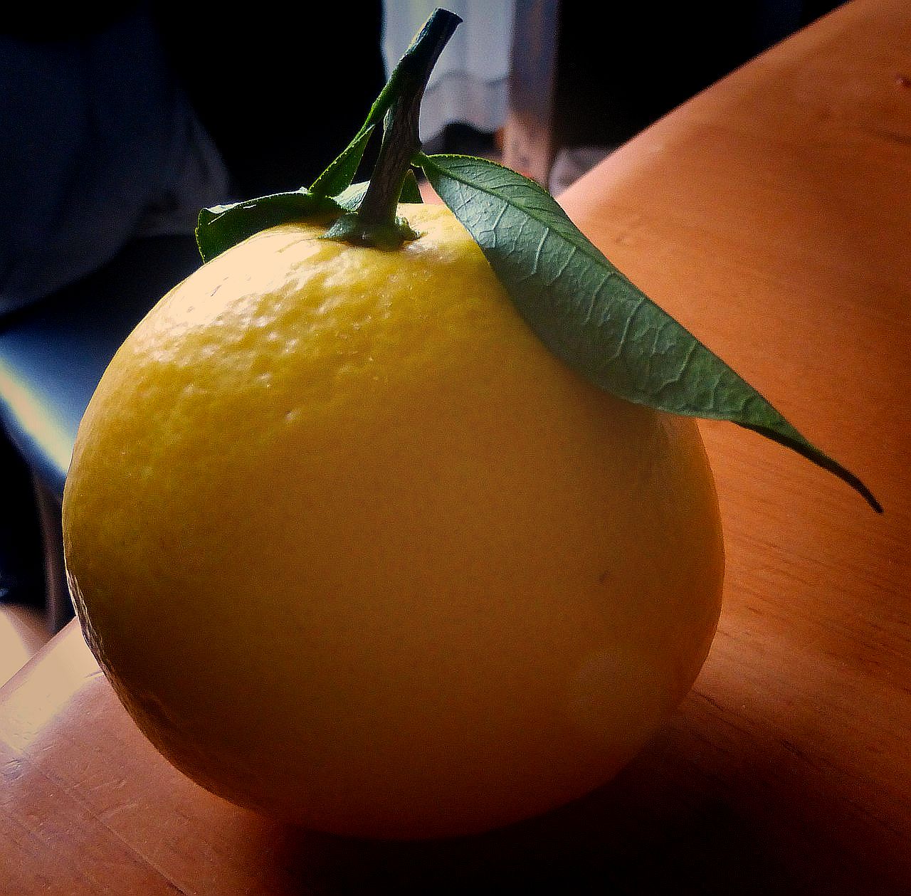 The fruit is averaging 8 to 10 centimeters in diameter and has a round, oval, to slightly ovate shape, sometimes with a bump under the twig, sometimes not. The rind ripens from green to bright yellow or yellow-orange and is semi-rough, textured, thin, and leathery, covered in many small oil glands. Underneath the surface, there is a thick layer of white, spongy pith that is edible, contributing a sweet, mild flavor. The yellow flesh is aqueous, tender, and succulent. The fruit is very aromatic, releasing scents reminiscent of lemons mixed with grapefruit, and the flesh has a distinct sweet and sour, floral, fruity flavor with moderate acidity and honeyed nuances.
