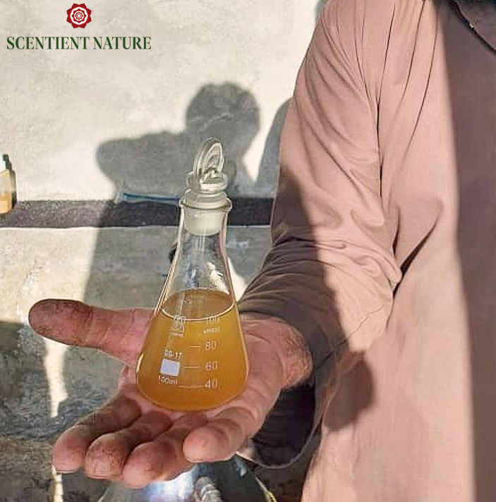 Manual slow low pressure hydro-distillation, in copper stills, driectly at the estate, a few metres from where that last bushes stop. Multiple gentle cycles for cohobation (until all is extracted).