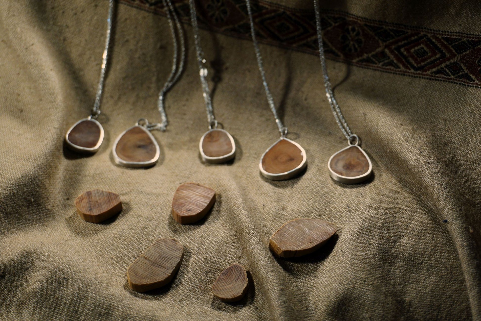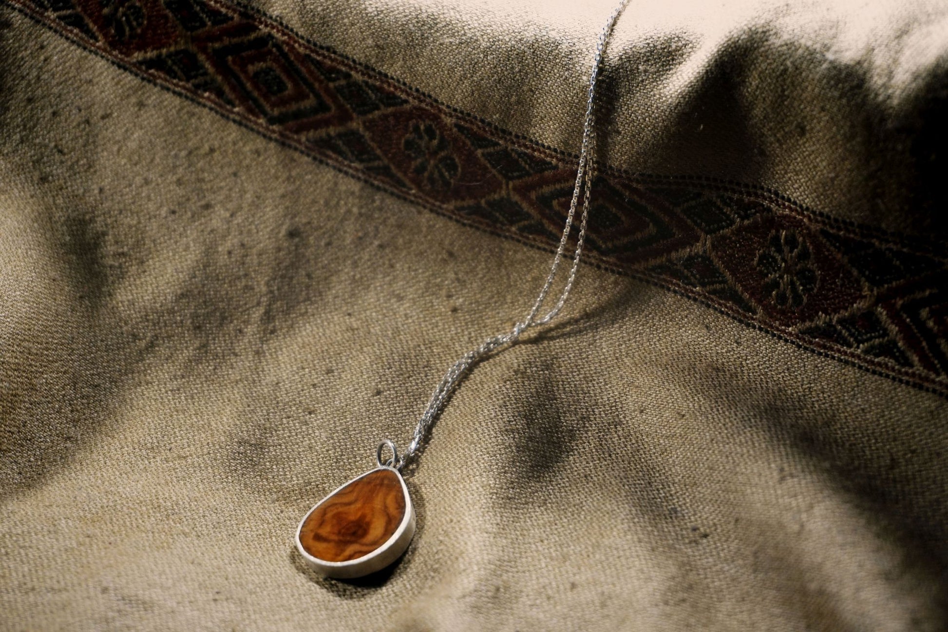 These pendant are hand made: we selected fine pieces of wood then polished them. They are the mounted by a professional jeweler we commission. The pendant's frame is pure silver 0.999, the chain is sterling silver (hypo-allergenic).